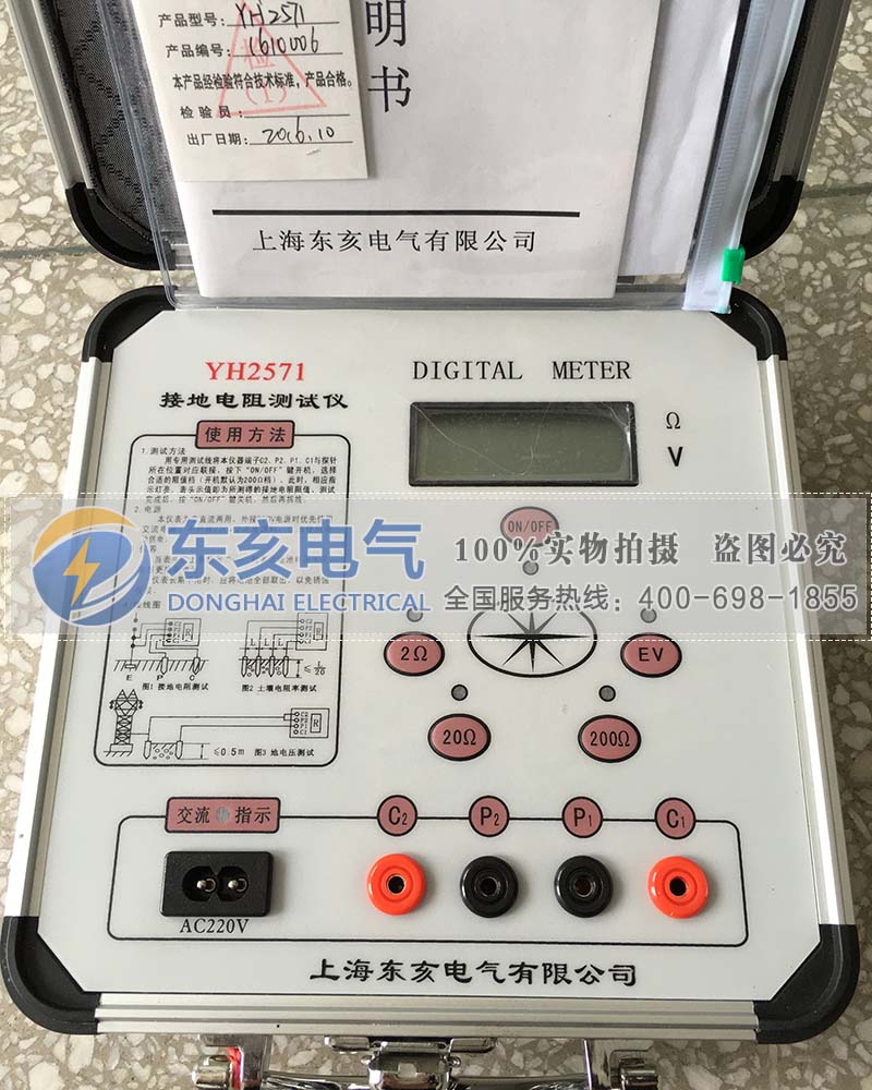 允許輔助接地電阻RC(C1與C2之間) 0~2Ω,2~20Ω ≤1KΩ 20~200Ω ≤2KΩ RP(P1與P2之間)<40KΩ 誤差≤±5% 允許地電壓(工頻有效值)≤5V 誤差≤±5% 5、電源及功耗 最大功率損耗≤2W 直流:8×1.5V(AA,R6)電池 交流:220V/50Hz 6.體積與重量 體積:220mm×200mm×105mm 重量:≤1.4kg